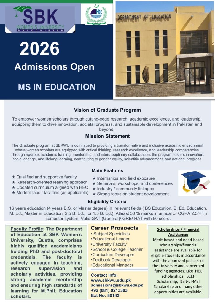 • To prepare highly skilled, ethical, and innovative educators, administrators, and researchers who advance the quality of education across Baluchistan and Pakistan.