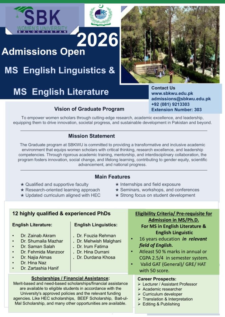 The department of English was established in 2004. The Department initiated its academic activities offering Masters classes with five faculty members and twenty-four students. The English Department of SBK Women’s university functions in coordination with the stated vision and mission of the institution that encompasses a goal to provide accessible and high quality education to women of Baluchistan and beyond. The target and aim of the Department emphasizes as its key center to foster an inclusive and dynamic academic environment that empower students with the knowledge, skills and critical thinking, the abilities that are necessary for thriving in the globalized world. Since 2004, the department of English aims to convey knowledge of literary history, literary forms, literary theory, and a wide variety of texts and an extensive array of vocabularies and practices used to consider them. It strives to give students an understanding to appreciate the literature. The department puts effort to provide students with sophisticated writing and critical thinking skills useful not only in the academy but also in the world at large. It offers opportunities to explore identity, values, manners, and morals.