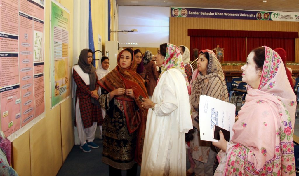 Prof. Dr. Rubina Mushtaq, Vice Chancellor SBKWU inspecting the poster during the poster competition of Basic Sciences Departments organized by ORIC SBKWU. Competition held at SBKWU on 30/6/2025.